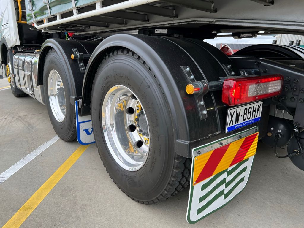 Trailer (left) and drive axle (right) tyres fitted to a linehaul B-double trailer set