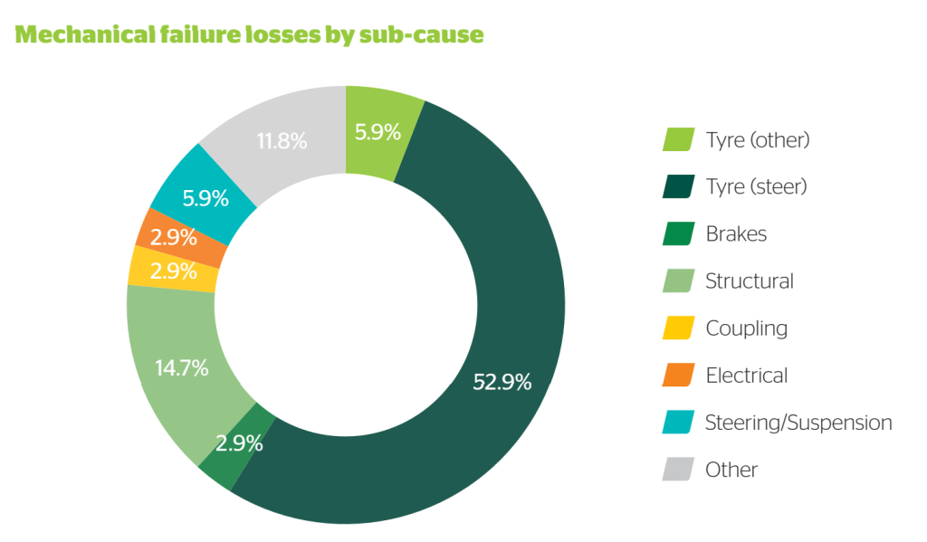 In its 2020 Major Accident Investigation Report, National Transport Insurance (NTI) analysed the causes of truck crashes resulting from mechanical failure, and found that steer tyre failure (blowout) contributed to more than half (52.9 per cent) of all mechanical failure crashes, and failure of tyres at other positions contributed to an additional 5.9 per cent.