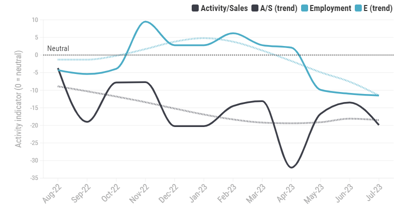 The activity/sales indicator continued to dip mildly in August, falling by 0.8 points to indicate broader contraction at -20.7.