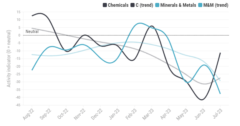 Chemical manufacturing declined again, by 4.3 points, to -15.5. The minerals and metals industry rebounded significantly, rising 17.3 points, albeit to -20.4.