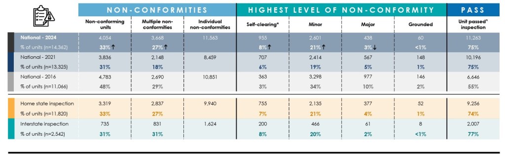 Seventy-five per cent of units passed inspection in the NHVR’s latest national roadworthiness survey – the same percentage as the 2021 survey, continuing the strong improvement over the 2016 benchmark survey of 55 per cent.