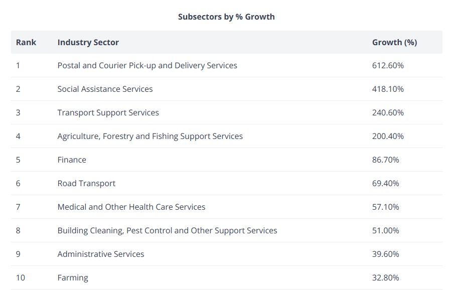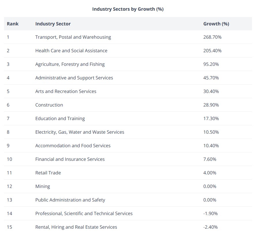 It found transport, postal and warehousing is now the country’s fastest-growing industry, with business registrations expanding 268.7 per cent over the past 10 years, followed closely by health care and social assistance, which grew 205.4 per cent nationwide.