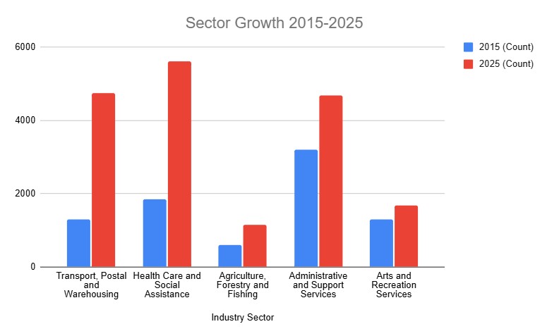 Businesses operating in health care and social assistance have more than doubled in size over the past 10 years, growing 205 per cent nationally through new business registrations. Growth has been driven by a mix of medical, allied health, social assistance and community-based support services responding to population growth and changing service delivery models.